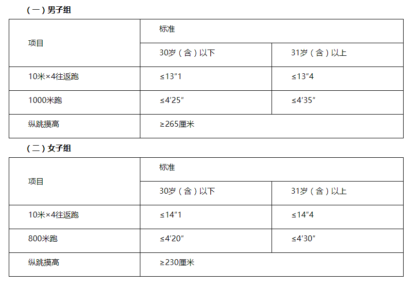 體能測評(píng)三項(xiàng)全部達(dá)標(biāo)方為合格。報(bào)考理化檢驗(yàn)、獄醫(yī)緊缺職位的人員,體能測評(píng)三項(xiàng)中有兩項(xiàng)達(dá)標(biāo)的,視為合格。