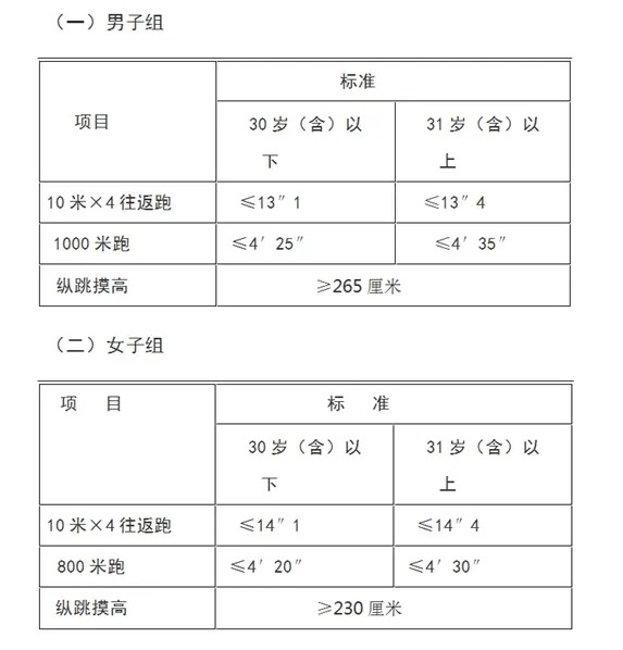 4.報考人員須參加全部三項體能測評,全部達(dá)標(biāo)方為合格,如放棄一項則視為不合格,體能測評合格的方可進(jìn)入下一環(huán)節(jié)。