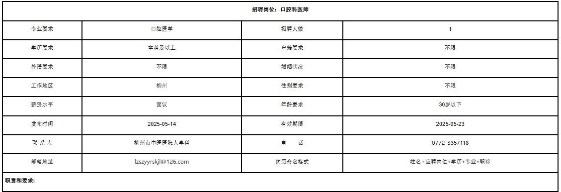 2025年廣西柳州口腔科醫(yī)師招聘1人