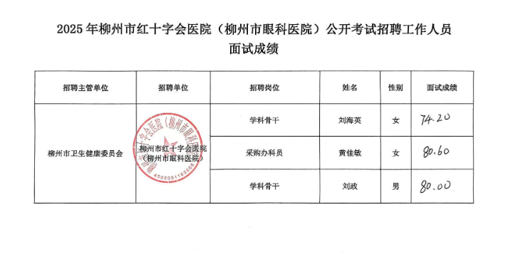 根據(jù)《2025年度柳州市紅十字會(huì)醫(yī)院(柳州市眼科醫(yī)院)公開(kāi)招聘中高級(jí)(急需緊缺)人才(第二批)面試公告》要求及安排,現(xiàn)將面試考生成績(jī)公示如下(詳見(jiàn)附表)。